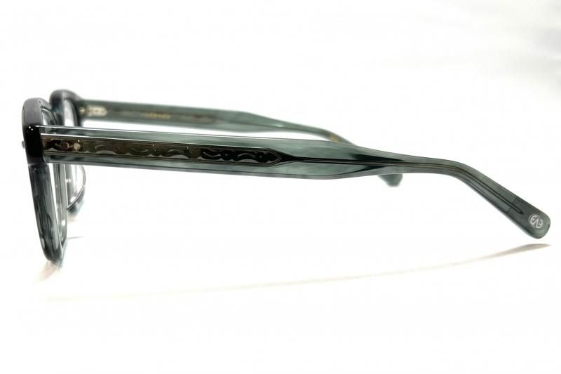 ボストンウェリントンフロントに、オリジナルのカシメ飾り丁番を採用したプラスチックフレーム。 テンプル芯には、クラシックカーのパーツからインスパイアされた柄を表裏に彫り込んだオリジナル芯を採用。